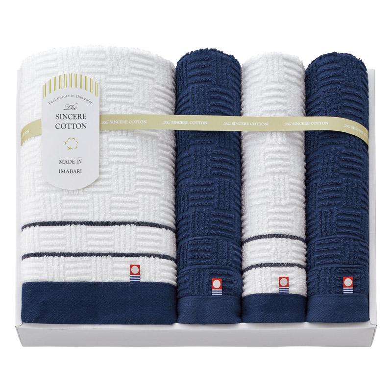 ネイビーとホワイトのコントラストが美しい品格あふれるギフトセット。ノーブルな紺色と白色のコントラストが美しい、高級感のあるタオルです。フォーマルでも映えるシックでモダンなデザインが自慢です。