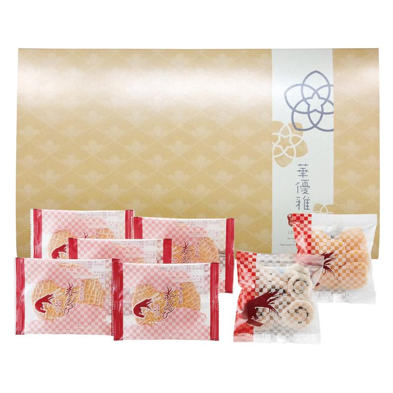 • 商品内容:赤えびせんべい(1枚)×5、えびせん(うず巻・えび松風)(各10g)×各1