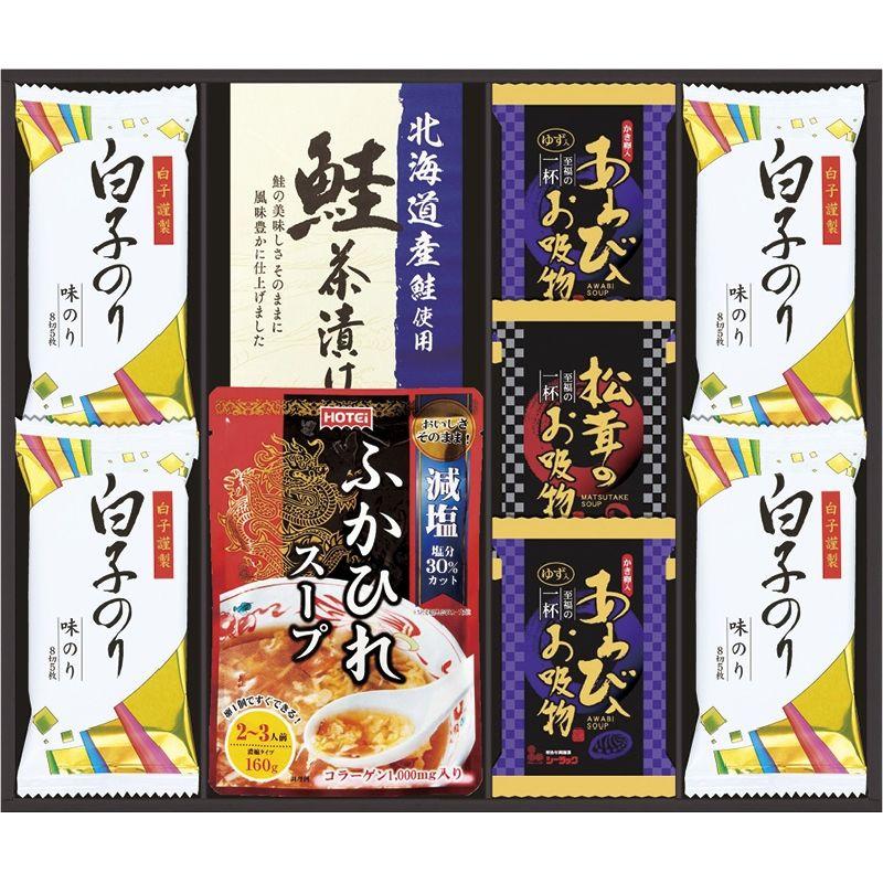 • 商品内容:白子のり(8切5枚)×4、あわび入お吸い物(4g)×2、ふかひれスープ(160g)・松茸のお吸い物(4.2g)・北海道産鮭茶漬け(4g×2袋)×各1