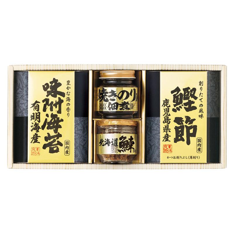 • 商品内容:焼きのり入佃煮(85g)・北海道産鰊フレーク(50g)・鹿児島県産鰹節(2g×3)・有明海産味附海苔(8切10枚入)×各1