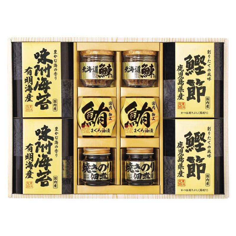 • 商品内容:焼きのり入佃煮(85g)・まぐろ油漬け(70g)・北海道産鰊フレーク(50g)・鹿児島県産鰹節(2g×3)・有明海産味附海苔(8切10枚入)×各2