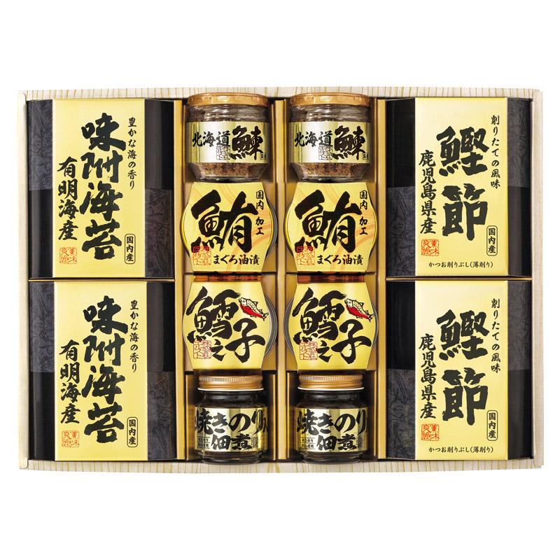 • 商品内容:焼きのり入佃煮(85g)・まぐろ油漬け・鱈之子味付け(各70g)・北海道産鰊フレーク(50g)・鹿児島県産鰹節(2g×3)・有明海産味附海苔(8切10枚入)×各2