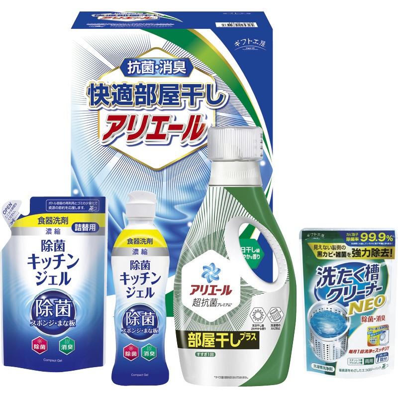 生乾き臭・カビ臭にWで効く部屋干し用のアリエールジェルと本格消臭の抗菌部屋干しソフター、食器洗剤除菌キッチンジェルが入ったクリーンギフトです。