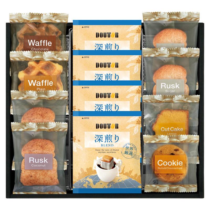 • 商品内容:ドトールドリップコーヒー(7g)×4、ラスク(シュガー・ココナッツ)×各2、ワッフル(プレーン・チョコ)・ナッツとチョコのざっくりクッキー・レモンケーキ×各1
