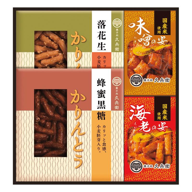 • 商品内容:かりんとう(蜂蜜黒糖・落花生)(各40g)・あられ(海老・味噌)(各12g)×各1