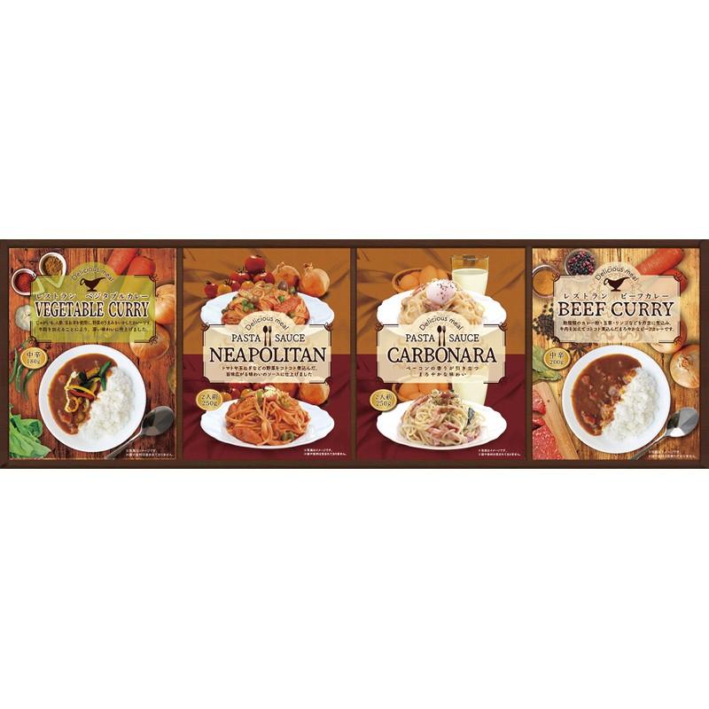 • 商品内容:パスタソース(ナポリタン・カルボナーラ)(各250g)・ビーフカレー・ベジタブルカレー(各180g)×各1