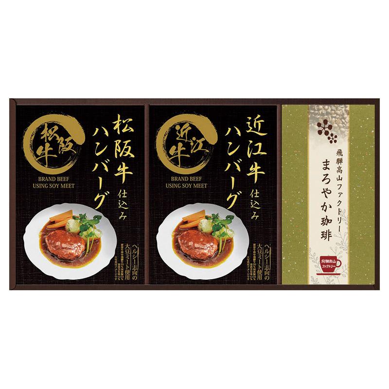 • 商品内容:飛騨高山ファクトリードリップ珈琲(まろやか)×各3、松阪牛仕込みハンバーグ(大豆ミート入り)・近江牛仕込みハンバーグ(大豆ミート入り)(各130g)(個形量80g))×各1