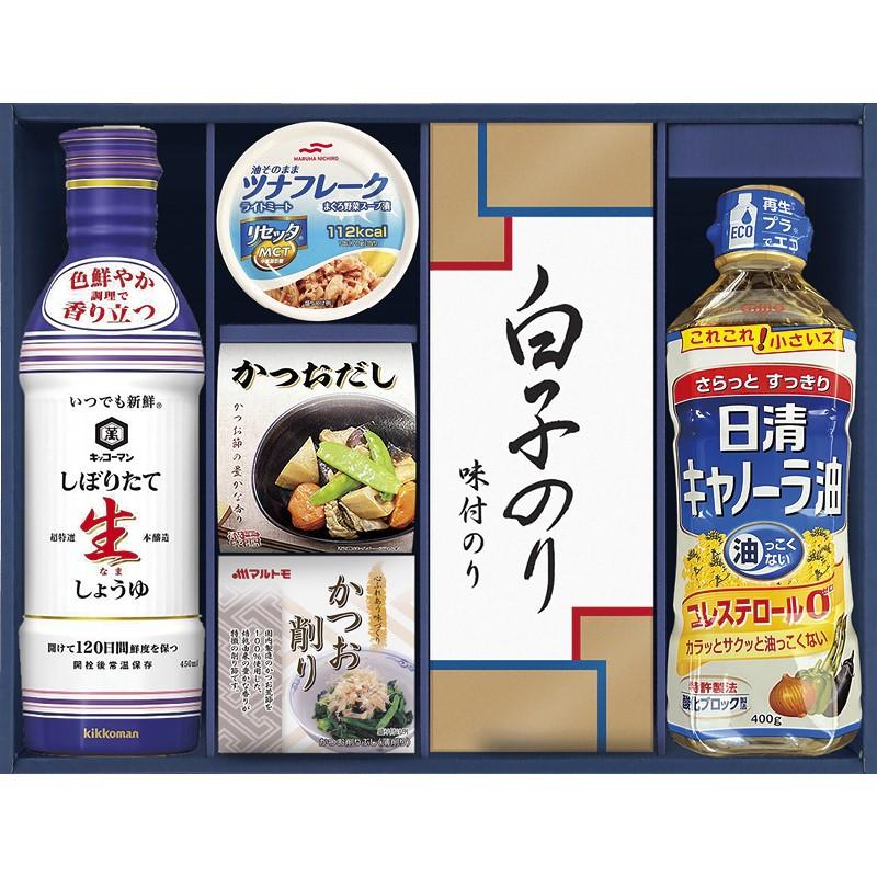 • 商品内容:キッコーマンしぼりたて生しょうゆ(450ml)・日清キャノーラ油(400g)・マルハニチロ油そのままライトツナリセッタ(70g)・シーラックかつおだし(4g×3袋)・マルトモかつおパック(0.7g)・白子のり味付のり(3切5枚)×各1