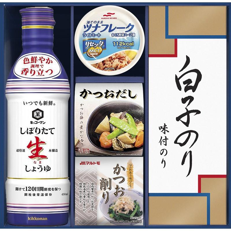 • 商品内容:キッコーマンしぼりたて生しょうゆ(450ml)・マルハニチロ油そのままライトツナリセッタ(70g)・シーラックかつおだし(4g×3袋)・マルトモかつおパック(0.7g)・白子のり味付のり(3切5枚)×各1