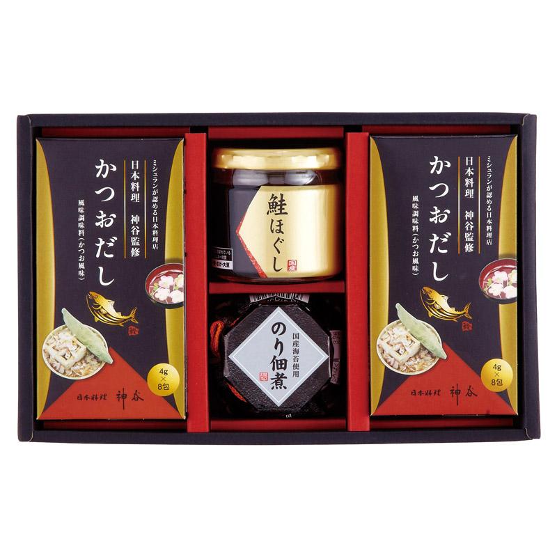 • 商品内容:かつおだし(4g×8袋)×2、鮭ほぐし(50g)・のり佃煮(80g)×各1