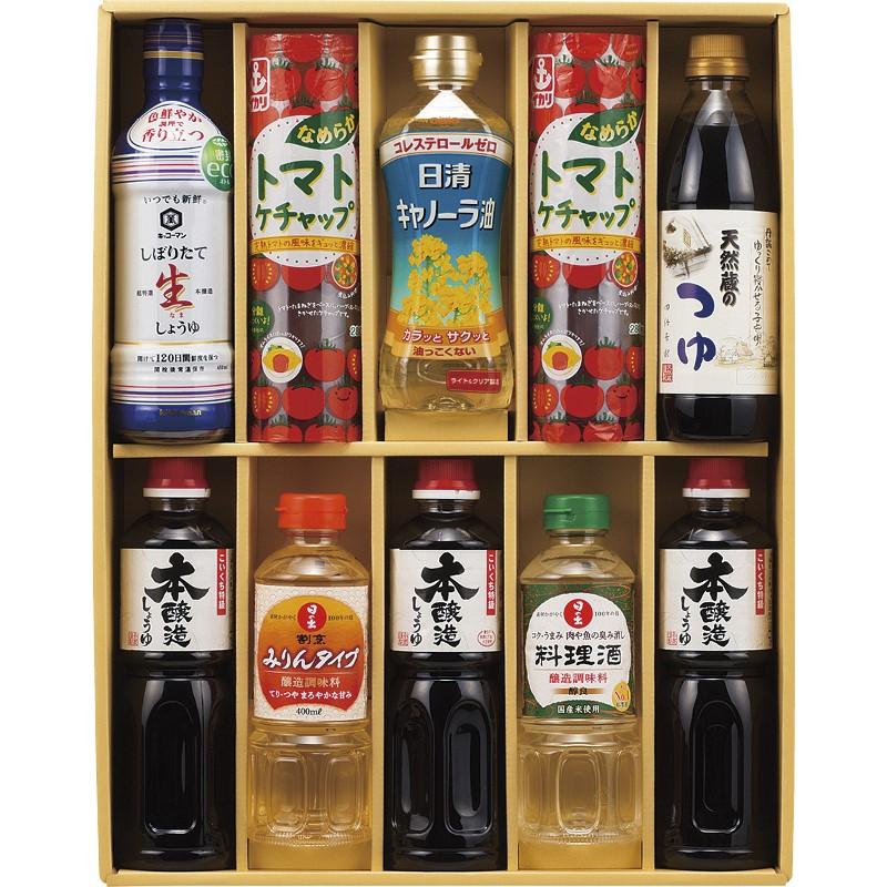 • 商品内容:サンビシ本醸造しょうゆ(500ml)×3、イカリなめらかトマトケチャップ(280g)×2、伊賀越天然蔵のつゆ(500ml)・キッコーマンいつでも新鮮しぼりたて生しょうゆ(450ml)・日の出(料理酒・割烹みりんタイプ)(各400ml)・日清キャノーラ油(350g)×各1