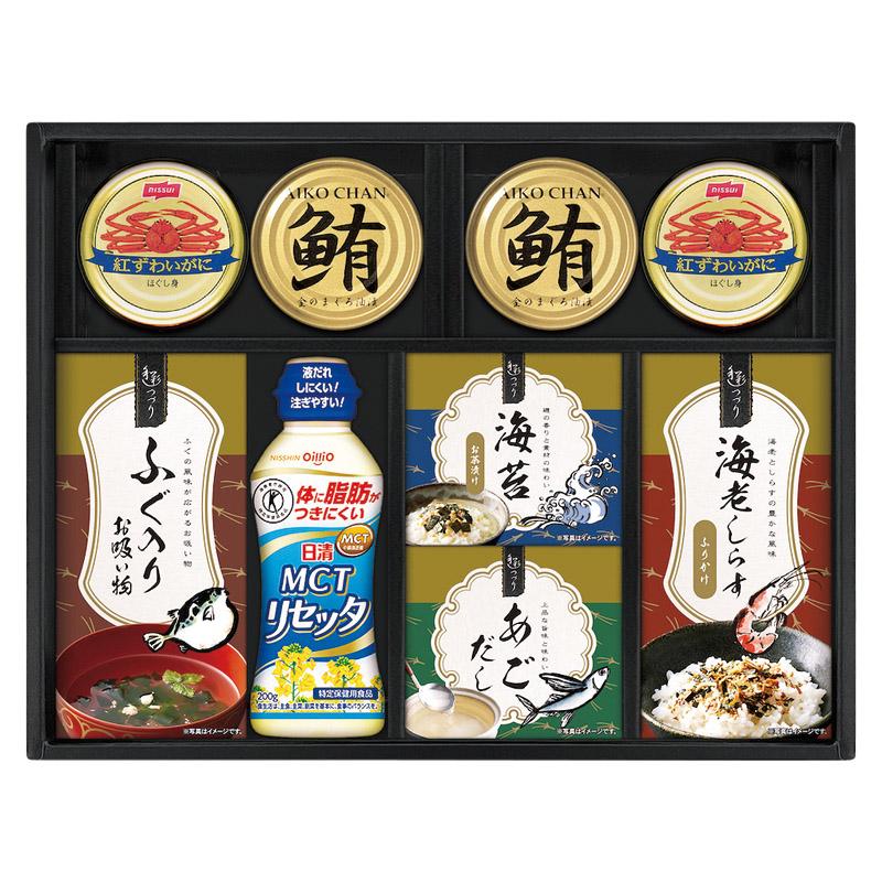 • 商品内容:鮪油漬けフレーク70g・ニッスイ紅ずわいがにほぐし身55g×各2、日清MCTリセッタ200g・海老しらすふりかけ(3g×3)・海苔茶漬け(5.5g×2)・あごだし(6g×2)・ふぐ入りお吸いもの(3.2g×3)×各1