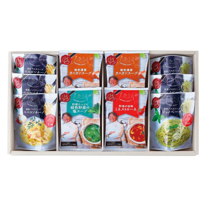 • 商品内容:ジェノベーゼ粉末パスタソース・ペペロンチーノ粉末パスタソース×各3、オニオンスープ×2、ミネストローネ・緑色野菜の塩スープ×各1