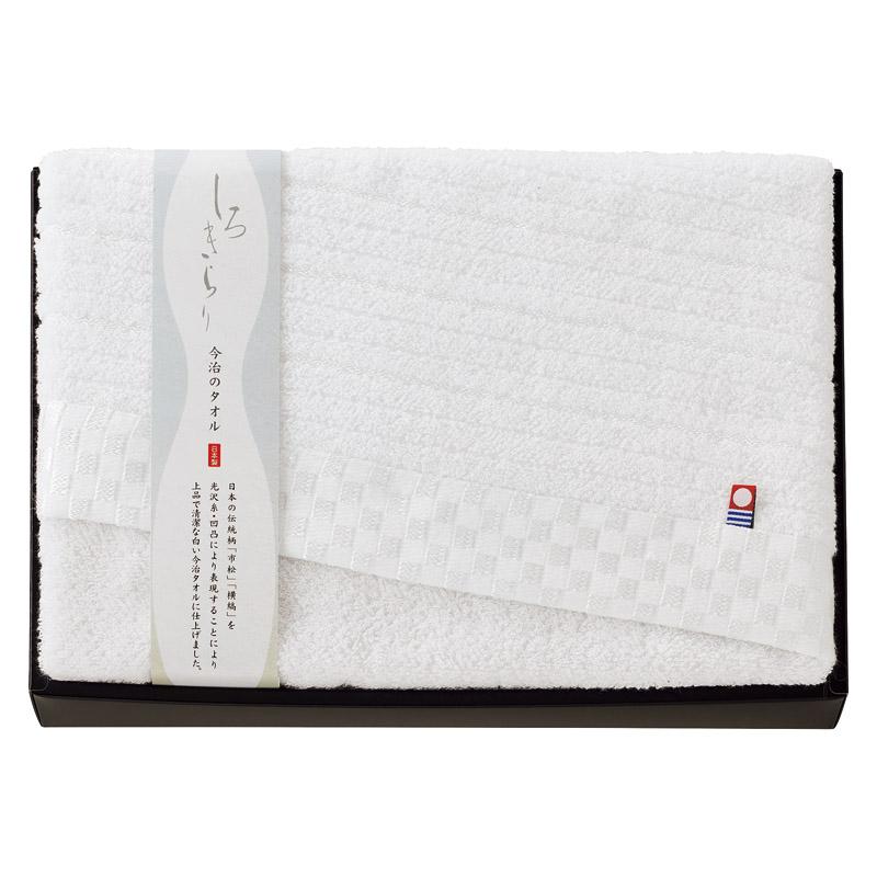 上品な白さの中に光沢糸がきらり。風合いも美しい上質な逸品。日本の伝統柄「市松」と「横縞」を、光沢糸とジャカード織りの凹凸により美しく表現。上品で清潔感あふれる白い今治タオルに仕上げました。慶弔を問わず幅広い世代の方に贈りやすい、ハイクオリティなタオルです。