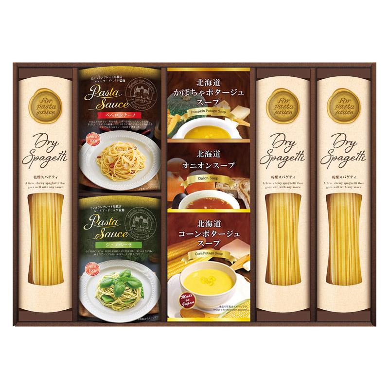 • 商品内容:スパゲティ(130g)×3、ル・トア・ド・パリ監修あえるパスタソース(ジェノベーゼ・ペペロンチーノ(各100g))・北海道スープ(コーンポタージュ・かぼちゃポタージュ(各16.5g))・オニオン(7g)×各1
