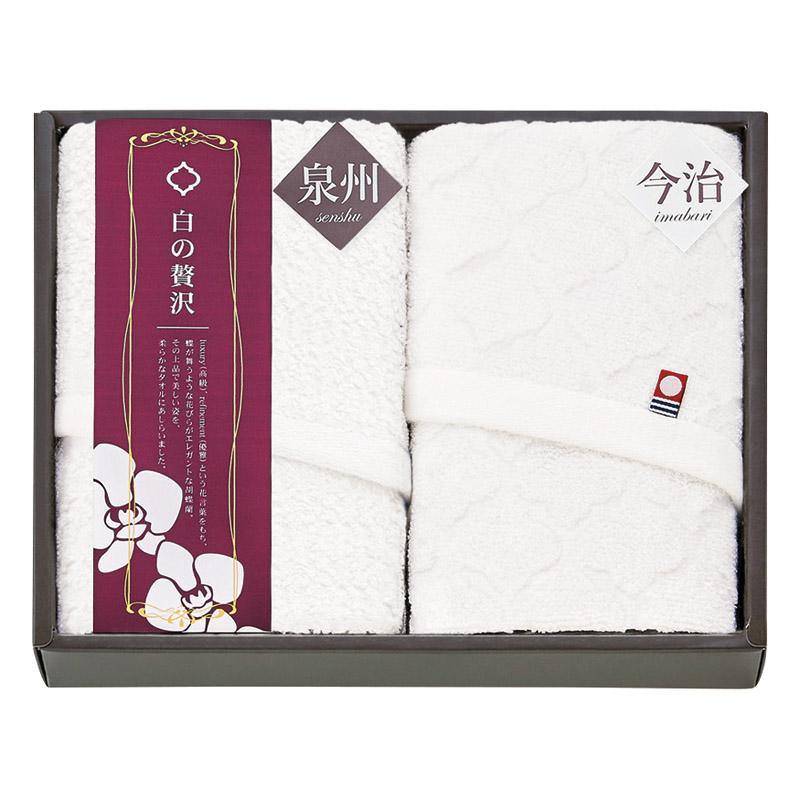 華麗な胡蝶蘭のような織柄をあしらった今治製と、吸水性が良く、ハンガーで干しやすいスリムサイズの泉州製。名産地の美しい白のタオルセットです。