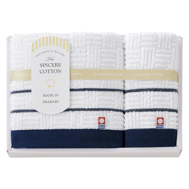 ネイビーとホワイトのコントラストが美しい品格あふれるギフトセット。ノーブルな紺色と白色のコントラストが美しい、高級感のあるタオルです。フォーマルでも映えるシックでモダンなデザインが自慢です。