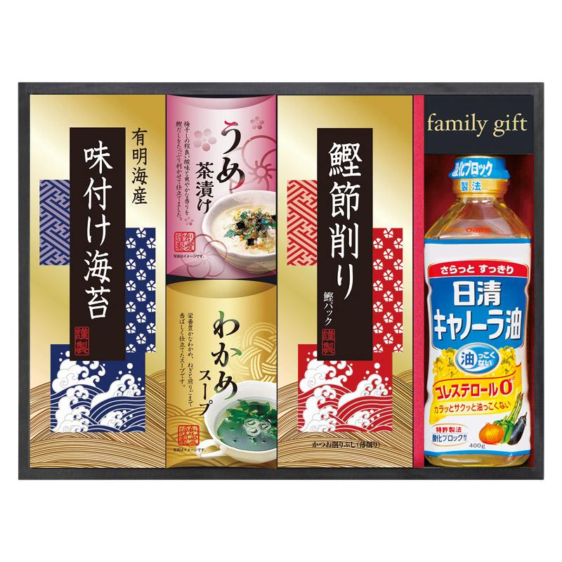 • 商品内容:有明海産味付け海苔(3切4枚)・うめ茶漬け(4.3g×2袋)・わかめスープ(5.3g×2袋)・鰹節削り(2g×4袋)・日清キャノーラ油(400g)×各1