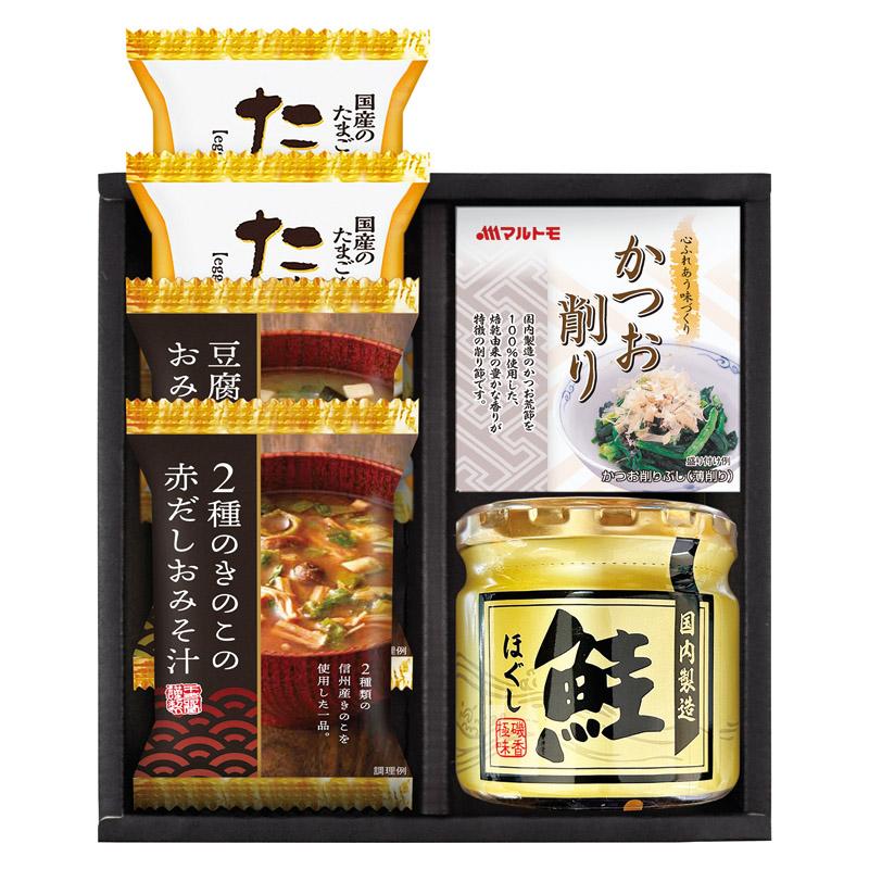• 商品内容:たまごスープ(6.4g)×2、とうふと油揚げのおみそ汁・2種のきのこの赤だしおみそ汁・マルトモかつおパック(0.7g×3)・鮭ほぐし(50g)×各1