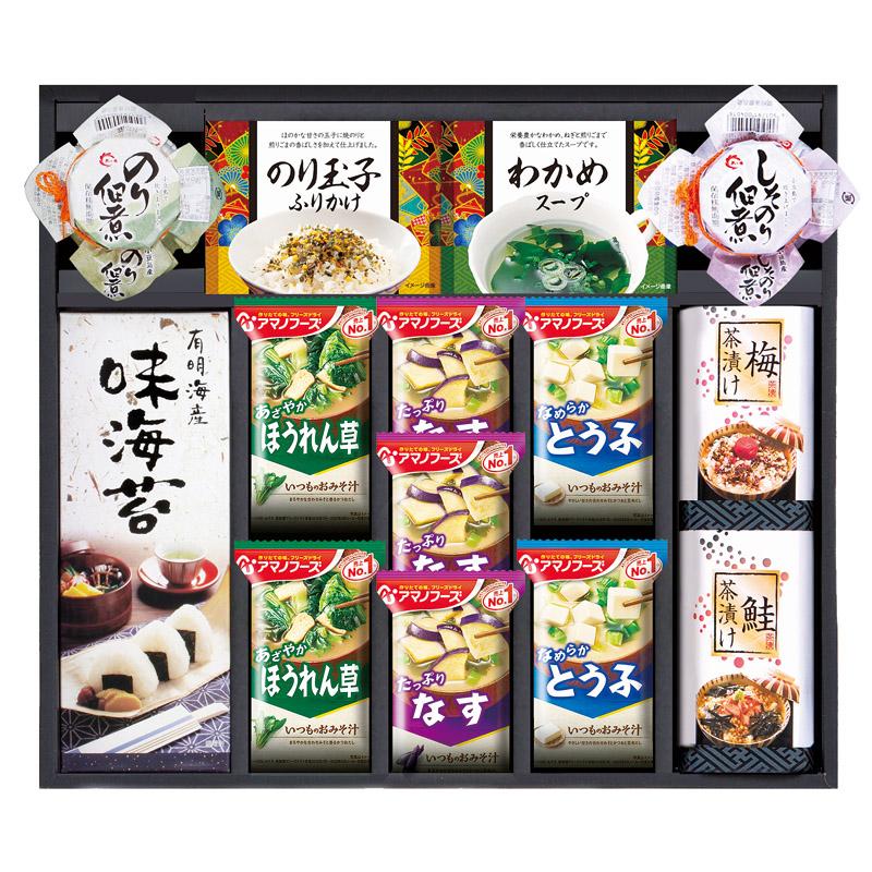 • 商品内容:アマノなすおみそ汁9.5g×3、アマノほうれん草おみそ汁7g・アマノとうふおみそ汁10g×各2、島の香のり佃煮80g・島の香しそのり佃煮80g・のりたまごふりかけ(4.5g×2)・わかめスープ(5.3g×2)・有明海産味付海苔(3切4枚)・梅茶漬け(4.3g×2)・鮭茶漬け(4.7g×2)×各1