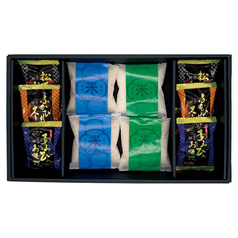 • 商品内容:新潟県産コシヒカリ・新潟県産こしいぶき(各150g)・ふかひれスープ(5.5g)・松茸のお吸物(4.2g)・あわび入お吸物(4g)×各2