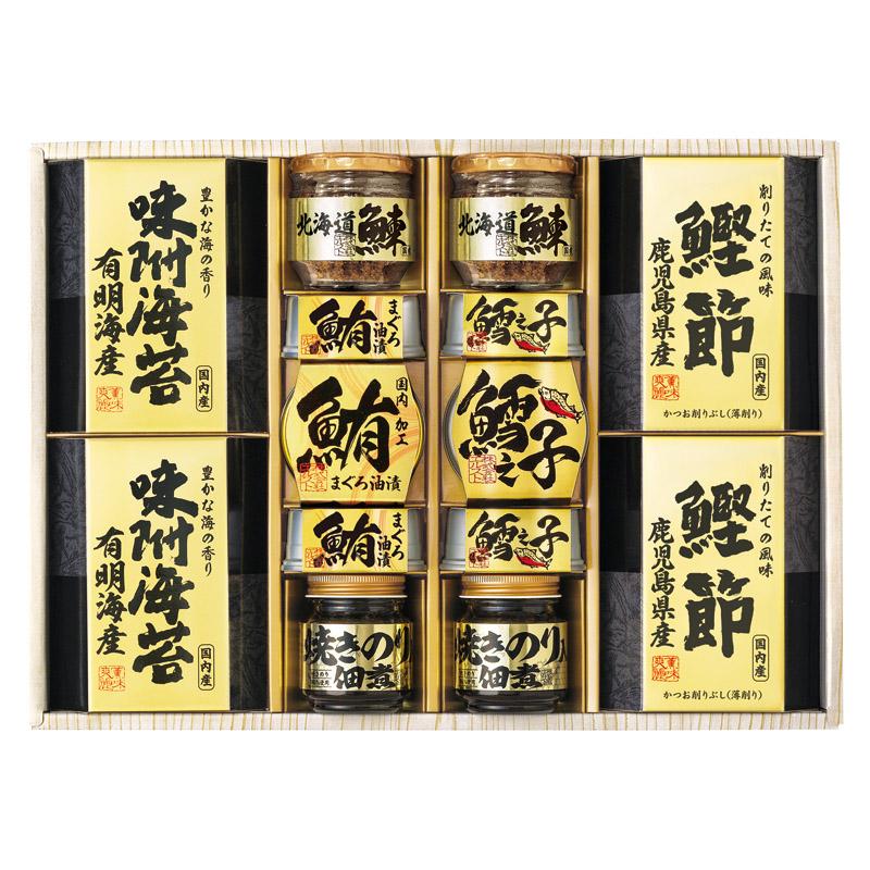 • 商品内容:まぐろ油漬け・鱈之子味付け(固形量45g)(各70g)×各3、焼きのり入佃煮(85g)・北海道産鰊フレーク(50g)・有明海産味附海苔(8切10枚入)・鹿児島県産鰹節(2g×3)×各2