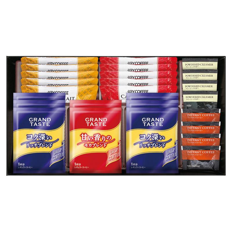 • 商品内容:キーコーヒードリップ(リッチブレンド)×6、キーコーヒースティック(カフェモカ)(7.8g)・キーコーヒースティック(カフェオレ)(7g)×各5、キーコーヒークリーミーパウダー(2.5g)・キーコーヒーインスタントコーヒー(2g)×各4、キーコーヒードリップ(モカブレンド)×2