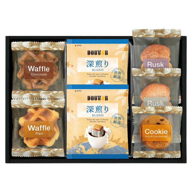 • 商品内容:ドトールドリップコーヒー(7g)×2、ラスク(シュガー・ココナッツ)・ワッフル(プレーン・チョコ)・ナッツとチョコのざっくりクッキー×各1