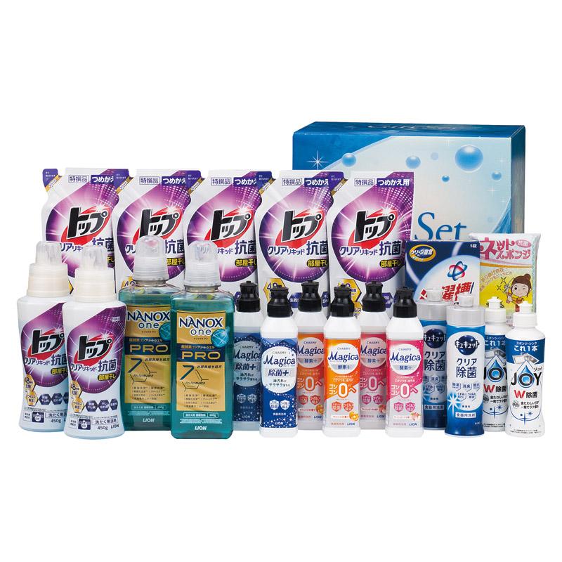 • 商品内容:ライオントップクリアリキッド抗菌(つめかえ用)(350g)×5、ライオンNANOX one PRO(本体)(600g)・ライオントップクリアリキッド抗菌(本体)(450g)・P&G除菌ジョイコンパクト(170ml)・ライオンCHARMY Magica除菌+・ライオンCHARMY Magica酵素+オレンジの香り・ライオンCHARMY Magica酵素+フレッシュピーチの香り・花王キュキュット(クリア除菌)(各220ml)×各2、洗濯槽クリーナー5錠箱入・ネットスポンジ1P×各1