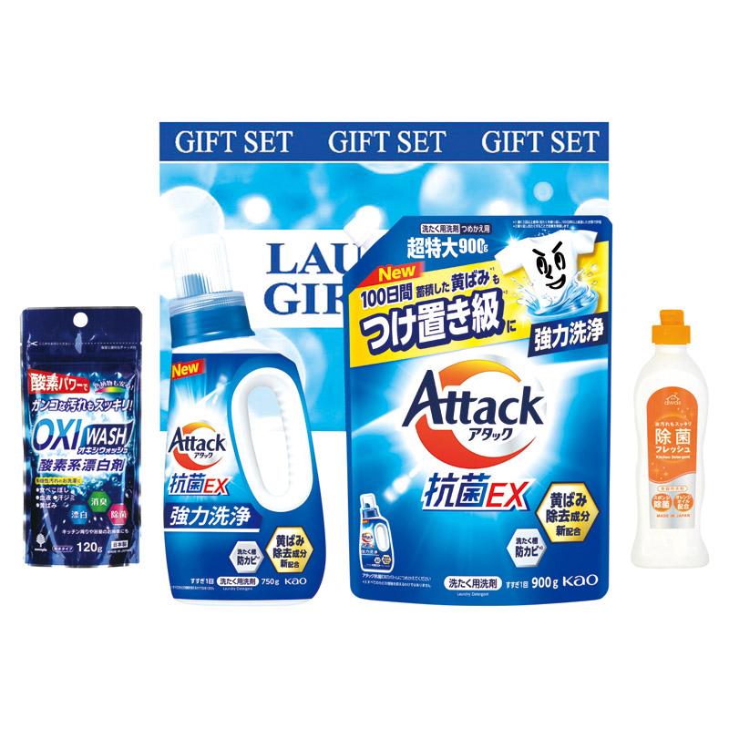 • 商品内容:アタック抗菌EX(750g)・アタック抗菌EX超特大(詰替)(900g)・OXIウォッシュ酸素系漂白剤(120g)・台所洗剤除菌フレッシュ(240g)×各1